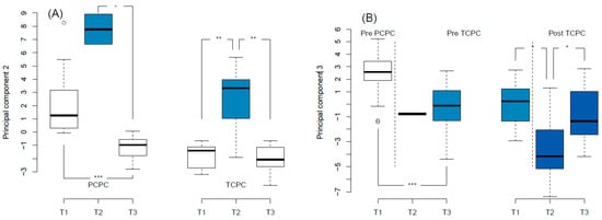 Principal component analysis. (A): Principal component 2 scores increased at the early post-operative study time point (T2). (B): Principal component 3 scores differed across Fontan palliation stages. Colors are arbitrary and added for clarity. PCPC: partial cavo-pulmonary connection; TCPC: total cavo-pulmonary connection. * p < 0.05; ** p < 0.01; *** p < 0.001.