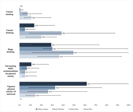 Figure 1 shows that current smoking was most prevalent among rural men (10.8%) and that drinking was most prevalent among urban men (38.6%). Manufactured cigarettes were the most common type of smoked tobacco, with hand-rolled cigarettes being consumed by 33.5% (95%CI: 11.9–65.4) of rural men and 5.3% (95%CI: 0.7–31.5) of urban men. Among current drinkers, nearly half of urban men and about one-third of rural men, urban women, and rural women reported binge drinking. The percentage of the population that did not meet the WHO recommendations for physical activity was lower than 11%, regardless of sex and place of residence. However, the proportion of young adults not engaging in at least 75 min of vigorous physical activity per week ranged between 14.5% among rural men and 61.6% among urban women.