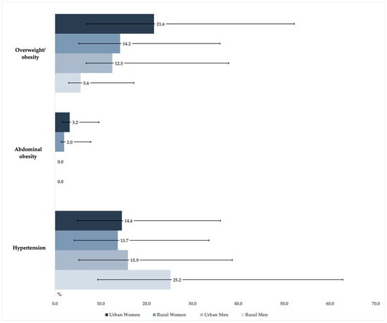The prevalence of being overweight/obese was higher in women, ranging from 5.6% among rural men to 21.6% among urban women. Abdominal obesity was observed only among women (urban: 3.2%; rural: 2.0%). Hypertension was more common in men from rural areas (25.2%) and ranged between 13.7% and 15.9% in the remaining groups (Figure 2). Among hypertensives, women and men from urban areas were the most aware of their condition (15.7% (95%CI: 6.4–33.4) and 6.3% (95%CI: 1.2–20.1), respectively), and only 1.9% of rural women and none of the rural men were aware of this condition. Hypertension treatment and control were observed only among urban women (8.4% (95%CI: 2.8–22.2) and 5.4% (95%CI: 1.5–18.0), respectively).