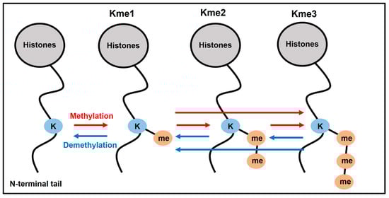 Methylation of lysine residues at the N-terminal tails of histone H3 and the lysine at the H4 N-terminus regulate major genomic functional processes [5]. Simply put, three of the lysine methylation sites have been implicated in transcriptional activation: H3K4, H3K36, and H3K79 (H3K4 and H3K36 have been associated with transcriptional initiation and elongation, respectively); and three other sites have been implicated in transcriptional repression: H3K9, H3K27, and H4K20 [6]. Each lysine residue can accept up to three methyl groups to form mono-, di-, and trimethylated derivatives (Kme1, Kme2, and Kme3, respectively) (Figure 1). Further regulatory finetuning is achieved by balancing the activity of KMT with that of lysine demethylases (KDMs) (Figure 1). This shifts the epigenetic regulatory landscape from static to dynamic. Different methylation sites can act together to ‘‘poise’’ genes, which enables rapid activation upon lineage commitment. These double-methylated, i.e., bivalent, promoters carry marks for both activation and repression, so that the definitive cell types carry marks either in support of a transcriptionally active or a silent state, thus sustaining cell fate decisions [7]. Over fifty proteins encoded in the human genome are known or predicted KMTs (catalytic SET domain KMTs) [8]; each targets a specific histone-lysine (H_K_) and catalyzes any or a combination of me1, me2, or me3 [5]. In addition, over thirty histone demethylases (KDMs) have been described in humans, which can be broadly divided into lysine-specific demethylases (LSD, including nine KDM subfamilies) and the Jumonji C (JmjC) histone demethylases [9,10]. Some methylation marks are preferentially enriched at promoters of regulatory genes that control a variety of developmental pathways. The surrounding positioning sequence, spacing, and combination of methylation marks provide the context that links the methylated sites to downstream biological functions mediated by methyl lysine-binding proteins [2].