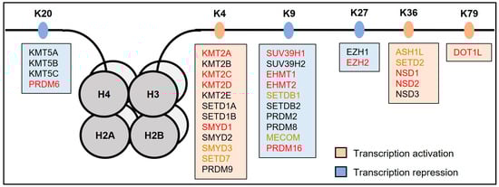 NSD1 (HGNC alias: KMT3B) and NSD2 (HGNC alias: KMT3G; MMSET) both enact H3K36me1 and H3K36me2 activity [103,104,105,106]. Mutations in NSD1 have been identified as the genetic cause of Sotos syndrome, which is characterized by pre- and postnatal overgrowth, notable craniofacial features, advanced bone age, and developmental delay. Moreover, a subset of patients presents with congenital heart defects [107,108,109]. A de novo variant in NSD1 was associated with atrioventricular septal defect, a specific cardiac malformation that presented as a congenital heart disease [110]; and, NSD1 genetic variants have been associated with congenital heart disease [25,99]. NSD2 (HGNC previous symbol: WHSC1) lies in the critical deletion region of Wolf–Hirschhorn syndrome (WHS; OMIM #194190), a neurodevelopmental disorder marked by facial dysmorphology and growth retardation, of which a subset of patients presented with congenital heart disease [111]. Finally, variants in NSD2 have been associated with congenital heart disease [100]; in fact, both loss-of-function (LoF) and gain-of-function (GoF) variants in NSD2 have been associated with abnormal heart morphology linked to disrupted cardiac patterning [100,112].