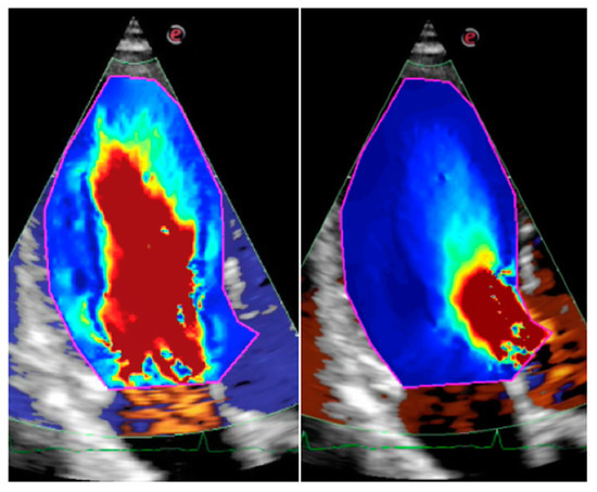 In recent years, analysis of kinetic energy (KE) and the rate of kinetic energy dissipation (KED) or energy loss (EL) within the cardiac chambers has become possible using different cardiac imaging techniques, such as four-dimensional (4D) flow cardiac magnetic resonance (CMR), contrast echocardiography with particle imaging velocimetry (Echo-PIV), and color Doppler-based ultrasound techniques [1]. These measures are of potential interest in cardiology since they potentially represent a new way to observe cardiac function and workload [1]. Analysis of KE and KED/EL has been applied to characterize athletes’ heart [2,3,4] and to patients with renal disease [5,6], prediabetes and type 2 diabetes mellitus [7], systemic lupus erythematosus [8], aortic regurgitation [9], aortic stenosis [10], cardiac amyloidosis [11], hypertrophic cardiomyopathy [12], myocardial infarction [13,14], and heart failure [15,16,17]. Although these applications are only preliminary, they clearly show the attention of clinical investigators toward the information coming from intracardiac flow dynamics analysis.