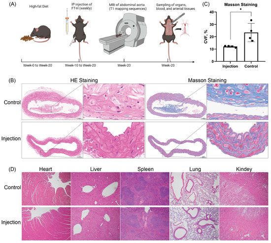 Illustration of the experimental procedure and analysis of HE staining and Masson staining of aortic plaques in Apo-E(−/−) mice. (A) Two groups of mice were fed on a high-fat diet for 20 weeks. FT-H was administered intraperitoneally to the injection group at week 10 for 10 weeks. At week 20, mice in both groups underwent abdominal aortic MRI, and tissue and blood sampling was performed at the end of imaging. (B) HE staining and Masson staining (10× magnified field of view and 40× magnified field of view) of the aortas of both groups of mice at 20 weeks. Collagen is blue in color and is mainly deposited between the intima and mesentery of the artery. Bar = 100 μm. (C) Graph showing the CVF value analysis results from the Masson staining of aortas in the 2 groups of 8 mice. * p < 0.05, black dots, visualization of numerical results. (D) Images show the HE staining results of the heart, liver, spleen, lungs and kidneys of both groups of mice.