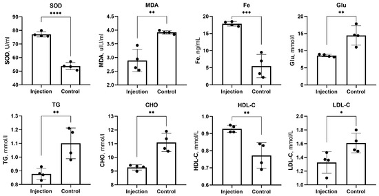 The mice were anesthetized with isoflurane (1–3%). Blood samples were taken, and then, the mice were euthanized. The sera obtained after centrifugation (3000× g for 15 min at 4 °C) were used to evaluate various serum biochemical parameters. Serum was analyzed for cholesterol (CHO), triglycerides (TG), high-density lipoprotein-C (HDL-C), low-density lipoprotein-C (LDL-C), serum iron (SF), superoxide dismutase (SOD), malondialdehyde (MDA) and glucose (Glu) according to the instructions of the commercial test kits (GM1113, GM1114, GM1115, GM1116, G4301-48T, GM1133, G4300-96T and GM1118, respectively; Servicebio; Wuhan, China). Among them, SOD acts as an antioxidant enzyme and reduces the toxicity of reactive oxygen species to blood vessels [24]. MDA, a lipid peroxide, can greatly impair the anti-atherosclerotic function of HDL [25].