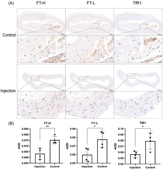 The mean AODs for FT-H, FT-L and TfR1 in the injection group and the control group at week 20 were 0.063 ± 0.005 vs. 0.075 ± 0.003, 0.060 ± 0.008 vs. 0.078 ± 0.009 and 0.057 ± 0.005 vs. 0.079 ± 0.014, respectively. The immunohistochemistry staining is shown in Figure 4. The deposition of FT-H, FT-L and TfR1 in the aorta was higher in the control group than in the injection group (p = 0.0054, p = 0.0242 and p = 0.0221). FT-H was deposited in the whole artery, and the deposition was greater than that of FT-L and TfR1.