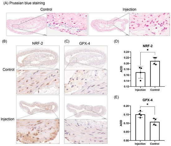 Prussian blue staining showed that the area of iron-positive areas in the aortic plaques of the control group was larger than that of injected group. The expression of NRF-2 was lower and the expression of GPX-4 was higher in the aortas of the injection group (p = 0.0179, p = 0.0161). The above results can be seen in Figure 5.
