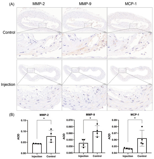 The mean AODs for MMP-2, MMP-9 and MCP-1 in the injection group and the control group at week 20 were 0.044 ± 0.001 vs. 0.078 ± 0.027, 0.053 ± 0.003 vs. 0.062 ± 0.004 and 0047 ± 0.001 vs. 0.062 ± 0.012, respectively. The immunohistochemical staining can be seen in Figure 6.