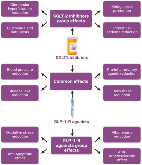 Here, we summarized and critically interpret the available literature on (i) the mechanisms of action and the beneficial and potential adverse effects of SGLT2 inhibitors and GLP-1-R agonists; (ii) effects of SGLT2 inhibitors and GLP-1-R agonists on renal outcomes in T2DM patients; and (iii) cardiovascular benefits emerging from implying SGLT2 inhibitors and GLP-1-R agonists.