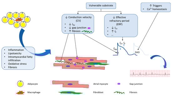 The pathophysiology of obesity-related AF is multifactorial and remains incompletely understood. One approach to conceptualizing this complex process is to use the framework of AF mechanisms (Section 3) and consider changes that increase the propensity of AF initiation (triggers) and/or create a more vulnerable substrate for AF maintenance.