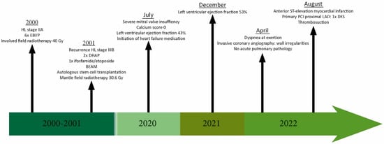 Twenty-two years earlier, our patient was diagnosed with Hodgkin lymphoma (HL) stage IIA, localized in the mediastinal and right supraclavicular areas, followed by a recurrence of HL stage IIIB in the left axillary region, in the para-aortic and iliac lymph nodes, and spleen one year later. He was treated with chemotherapy (EBVP, DHAP, BEAM, and ifosfamide/etoposide), radiotherapy (involved field and mantle field), and autologous stem cell transplantation. Involved field radiation doses were given in fractions of 1.8 Gy and 2.0 Gy, with maximum doses of 30.6 Gy and 40 Gy, respectively. During mantle field therapy, our patient was exposed to a maximum radiation dose of 14 Gy. Unfortunately, information about the cumulative heart dose was not available. The chronological summary of visits is shown in the timeline in Figure 1.