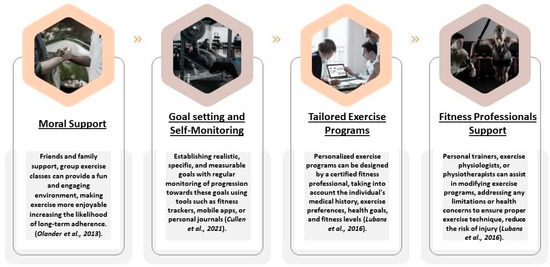Adherence to exercise programs is a significant factor in determining the long-term success of obesity management. A systematic review by Teixeira et al. [102] identified several key determinants of exercise adherence in obese individuals, including self-efficacy, intrinsic motivation, social support, and enjoyment of exercise. Additionally, factors such as accessibility, cost, and time constraints can influence adherence to exercise programs. Specifically, to enhance exercise adherence, several strategies have been proposed in the literature (Figure 3).