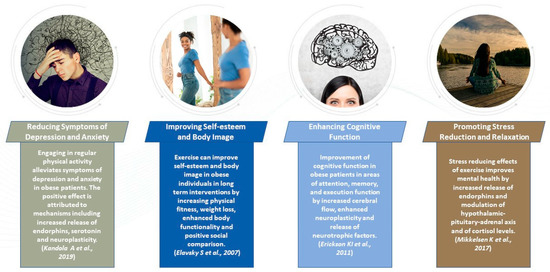 Impact of exercise on mental health in obese patients [102,104,105,106].