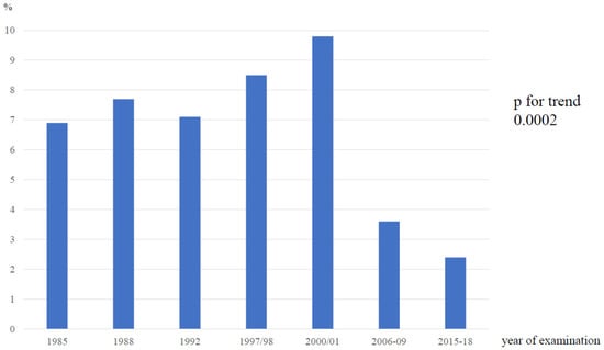 The overall prevalence of severe dyslipidemia in our population between 1985 and 2015–2018 was 6.6% (1351 cases out of 20,443 screened individuals), varying between 2.4 and 9.8% (Figure 1), with a significant downward trend from the fifth survey (p for trend 0.0002).