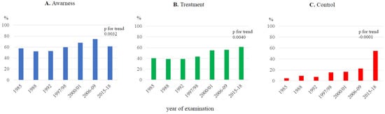 There was a significant increase in the mean age of individuals with severe dyslipidemia over the duration of the seven cross-sectional surveys (Table 2). The same trend was observed for BMI (1985: 28.6 ± 4.52 kg/m2; 2015–2018: 29.6 ± 4.18 kg/m2; p = 0.039). Unfortunately, the prevalence of smoking among individuals with severe dyslipidemia remained unchanged over the study period, varying from 27.5% to 37.6%. There was a significant decrease in BP (both SBP and DBP), resulting in a decline in the prevalence of hypertension. Figure 2 shows the awareness, treatment, and control of hypertension among individuals with severe dyslipidemia, indicating a significant improvement in all these parameters over the duration of the study. Data on the prevalence of diabetes were available only from the fourth survey onwards, showing no increase and varying between 4.7 and 10%. Similarly, data on self-reported cardiovascular disease of atherosclerotic origin (ASCVD) were also available only from the fourth survey, with a significant decline in its prevalence from 1997/1998 to 2015–2018.