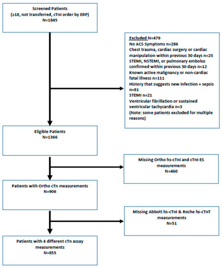 - Kavsak, P.A.; Mondoux, S.E.; Martin, J.; Hewitt, M.K.; Clark, L.; Caruso, N.; Mark, C.-T.; Chetty, V.T.; Ainsworth, C.; Worster, A. Disagreement between Cardiac Troponin Tests Yielding a Higher Incidence of Myocardial Injury in the Emergency Setting. J. Cardiovasc. Dev. Dis. 2021, 8, 31. [Google Scholar] [CrossRef] [PubMed]