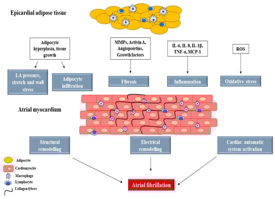- Hatem, S.N.; Redheuil, A.; Gandjbakhch, E. Cardiac adipose tissue and atrial fibrillation: The perils of adiposity. Cardiovasc. Res. 2016, 109, 502–509. [Google Scholar] [CrossRef]