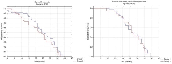 The two groups did not differ from each other in terms of survival of decompensation of heart failure referred to hospitalization due to decompensation of HF or intensification of HF treatment (diuretics) (group 1: 18.3% vs. group 2: 36.6%, p = 0.705) and survival of death (group 1: 1.7% vs. group 2: 4.9%, p = 0.165) (Figure 1).