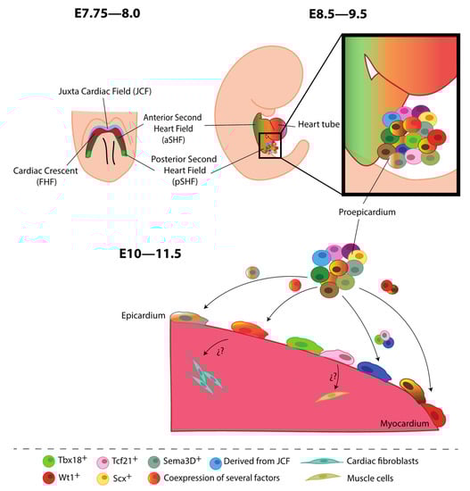 - Lupu, I.E.; Redpath, A.N.; Smart, N. Spatiotemporal analysis reveals overlap of key proepicardial markers in the developing murine heart. Stem Cell Rep. 2020, 14, 770–787. [Google Scholar] [CrossRef] [PubMed]