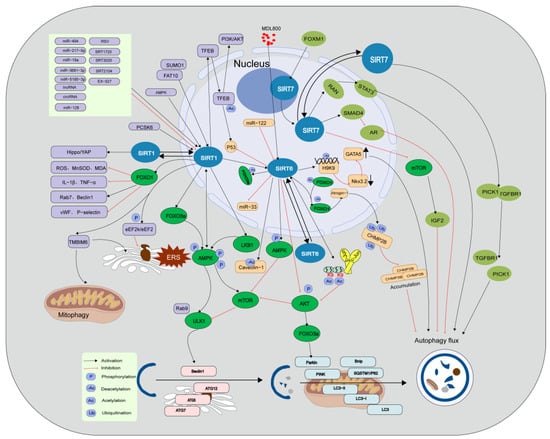 SIRT7, a Sirtuin primarily localized in the nucleolus, is relatively less studied for its role in autophagy regulation [,]. Silencing forkhead box M1 promotes cellular autophagy by regulating the SIRT7/mTOR/insulin-like growth factor 2 pathway []. In osteoarthritis, increased SIRT7 expression in chondrocytes activates autophagy to prevent cartilage degeneration []. In prostate cancer cells, SIRT7 indirectly promotes autophagy by regulating the androgen receptor signaling pathway, while its depletion substantially inhibits androgen-induced cell autophagy []. Additionally, SIRT7 promotes the deacetylation of RNA N-deacetylase by competitively binding with Ribosomal L1 domain-containing protein 1, thereby leading to the accumulation of nuclear signal transducer and activator of transcription 3 (STAT3) and STAT3-regulated autophagy. However, a few studies have demonstrated that SIRT7 promotes the dissociation of proteins that interact with C kinase 1 and the transforming growth factor β receptor in the cytoplasm, which inhibits their autophagic degradation []. At present, the role of SIRT7-mediated autophagy in cardiovascular diseases remains unclear; hence, in vivo and in vitro trials must be conducted in the future (Figure 1).
