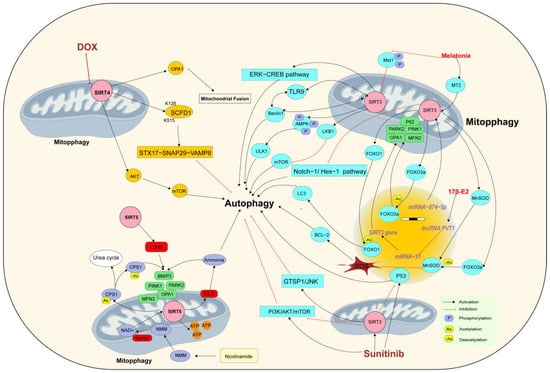SIRT4 is localized in the mitochondria as well as the cytoplasm and exhibits the catalytic capabilities of various enzymes, allowing it to participate in various pathological and physiological processes, such as energy metabolism, oxidative stress, autophagy, and aging. Studies have revealed that SIRT4 interacts with the optic atrophy 1 protein to promote mitochondrial fusion, inhibit mitochondrial autophagy, regulate mitochondrial quality control, suppress oxidative stress, and delay aging []. SIRT4 overexpression inhibits doxorubicin (DOX)-induced cardiac toxicity by suppressing the AKT/mTOR autophagy pathway []. Furthermore, research has revealed that SIRT4 deacetylates sec1 family domain containing 1 at the K126 and K515 residues, thereby facilitating the formation of the STX17-SNAP29-VAMP8 complex and promoting autophagy []. To date, limited studies have been conducted on the involvement of SIRT4 in autophagy regulation, particularly in cardiovascular diseases. Further investigations are necessary to elucidate the role of SIRT4 in mitochondrial autophagy (Figure 2).
