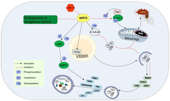 The precise mechanism by which SIRT2 regulates cardiovascular autophagy remains unclear. Starvation, oxidative stress, and cold exposure decreased SIRT2 expression, resulting in an increase in FOXO1 acetylation. Acetylated FOXO1 binds to ATG7, promoting its acetylation and inducing ERS and autophagic interactions []. SIRT2 directly binds to the 3′-untranslated region of TFEB and enhances its mRNA stability, thereby facilitating autophagosome formation and autophagy component release []. In hypertrophic hearts, SIRT2 restores AMPK activity by interacting with LKB1, an upstream kinase of AMPK. Moreover, SIRT2 promotes LKB1 phosphorylation and the subsequent amplification of the LKB1/AMPK signal by binding to LKB1 and deacetylating it at lysine residues [,]. SIRT2 deficiency results in increased acetylation of mitochondrial proteins, and its activation is associated with the deacetylation of α-tubulin, which leads to impaired autophagy clearance, impeded transportation, and the elimination of misfolded proteins. However, the loss of SIRT2 function as a result of knocking out the specific inhibitor AK-7 or SIRT2 leads to the restoration of microtubule stability and enhancement of autophagy []. Nevertheless, research has validated that SIRT2 is localized not only in the cytoplasm but also within mitochondria, playing a role in autophagy and possibly having unique mitochondrial targets [] (Figure 3).