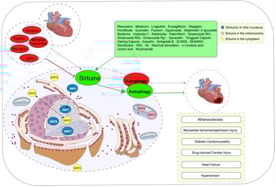 Biological significance of Sirtuin-mediated autophagy in cardiovascular diseases. The subcellular localization of Sirtuins proteins is contingent upon the specific cell type, cellular state, and molecular interactions. Most of the adverse factors, such as ischemia, hypoxia, starvation, metabolic abnormalities, and aging, lead to cardiovascular diseases by inhibiting Sirtuin-mediated autophagy. However, in a few cases, adverse factors contribute to the occurrence of cardiovascular disease by activating Sirtuin-mediated autophagy. At present, a variety of drugs can alleviate various stress injuries by regulating Sirtuin-mediated autophagy and having cardiovascular protective effects. SIRTs are silent information regulators.