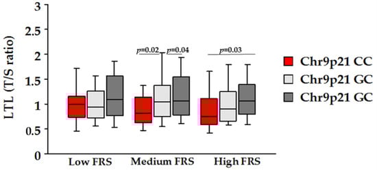 The comparison of allele C carriers with GG carriers (AG and AA genotypes combined) also revealed a significant difference (p = 0.005). The analysis of biochemical parameters across genotypes revealed no significant differences, with the exception of cholesterol (p = 0.03) and LDL (p = 0.04) levels in patients carrying the C allele compared to the GG genotype. There was no significant interaction between Chr9p21 rs1333049 variant and common risk factors on LTL. However, the lower value of LTL was observed in carriers of the CC genotype and with high-risk FRS (Figure 3).