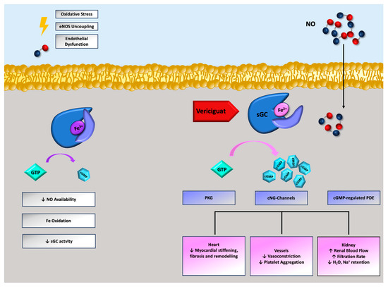 The nitric oxide (NO)-sGC-cyclic guanosine monophosphate (cGMP) cascade plays a crucial role in cardiovascular homeostasis [8]. The primary source of NO is the endothelium, which is continuously stimulated by hormones and physical triggers to produce it through endothelial NO synthase (eNOS) activity [9,10]. NO is highly diffusible, and thus, quickly spreads into smooth muscle cells, increasing the activity of sGC and, therefore, the production of cGMP, which exerts several positive effects in multiple organs [11] (Figure 1). In HFrEF, the presence of low-grade but persistent inflammation and endothelial dysfunction results in decreased bioavailability of NO, leading to reduced cGMP synthesis [12]. A deficiency of cGMP causes coronary and renal circulatory dysfunction, as well as microcirculatory dysfunction, perpetuating a vicious cycle of myocardial injury and fibrosis with further inflammation [13,14,15]. Given the crucial role that cGMP plays in the pathophysiology of HFrEF (Figure 1), recent research has focused on the search for drugs that can interact in a “smart” manner [16,17] with this pathophysiological cascade, unlike “traditional” drugs, such as nitrates and phosphodiesterase inhibitors [18,19]. Activators of sGCs, such as cinaciguat, increase cGMP levels through direct (NO-independent) activation of sGCs, and are theoretically helpful in patients with acute heart failure or advanced heart failure (and therefore with a greater degree of reduction in NO levels related to oxidative stress and endothelial dysfunction); however, their clinical use is limited by symptomatic hypotension [20,21]. In contrast, sGC stimulators (riociguat and vericiguat), by increasing the sensitivity of sGC to endogenous NO, exert a more physiologic action, which, while causing clinical benefits to be absent in the advanced stages of the disease (see below), justifies the lower rate of symptomatic hypotension [22,23].