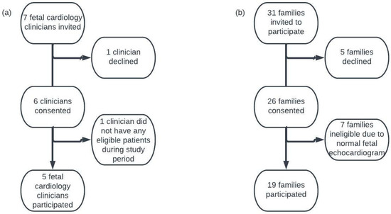 Recruitment flow diagram. (a) Fetal cardiology clinician recruitment diagram. (b) Family recruitment diagram.
