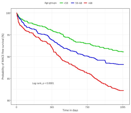 Figure 1 shows Kaplan–Meier curves and the 95% CI for the three groups of patients. The curves tend to separate over time, indicating a higher rate of MACE with increasing patient’s age. The log-rank p-value was <0.0001, confirming a different event rate on time among groups.