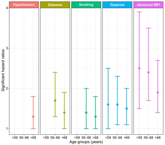 with assumed to be Poissonian. In our investigation, we considered the following risk factors: gender, body mass index, diabetes, hypertension, hyperlipidemia, smoking, angina, dyspnea, CAD, and MPI outcome. For each age group, these factors were used as independent variables in a Cox’s regression multivariable analysis with MACE as dependent variable. The Cox’s model is the most commonly used multivariable approach for censored survival time data analysis in medical research. By this regression model, are described the relation between the event incidence, as expressed by the hazard function and a set of covariates. A property of this statistical technique is that each variable is adjusted by removing the effect of the other covariates. We also reported the hazard ratios (HR) computed by the Cox’s analysis, which represent the increased risk of MACE in patients with a risk factor with respect to patients without that risk factor, in a considered interval of time. As post-hoc analyses, we evaluated the incremental value of MPI covariate by the likelihood ratio test (LRT), and performed the Cox’s regressions separately for patients with suspected and known CAD. In this way, we verified the contribution to the significant covariates due to the two sub-groups, which have a different risk at baseline. Two-sided p-values < 0.05 were considered statistically significant. Confidence intervals (CI) were computed at 95%. Overlayers at 95% CI indicate no difference among age groups for significant risk factors. Statistical analysis was performed using the R software, version 4.3.0 (The R Foundation for Statistical Software, Vienna, Austria). Supplementary R packages for pre-processing, data analysis, and graphs were dplyr, survival, survplot, ggplot2, and ggfortify.