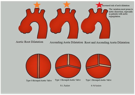 Aortic dilatation is frequently observed in a range of 20% to 84% of patients with BAV, primarily attributed to accelerated degeneration of the aortic media within the BAV microenvironment [54]. This degeneration occurs due to increased matrix metalloproteinase (MMP) activation, decreased fibrillin-1 (FBN1) expression, and elevated proinflammatory cytokine expression, influenced by both genetic and hemodynamic factors [58,59,60]. Notably, aortic dilatation progresses rapidly in BAV patients. Davies et al. examined aortic aneurysm status in patients with BAV and TAV, revealing that BAV patients are typically younger (49.2 vs. 64 years) and exhibit smaller aneurysm size (4.6 cm vs. 4.9 cm); however, the expansion rate is higher compared to patients with TAV [61]. Aneurysmal aortic dilatation in BAV patients exhibits variable morphology, with distinct features in terms of location and type, necessitating individual evaluation [20].