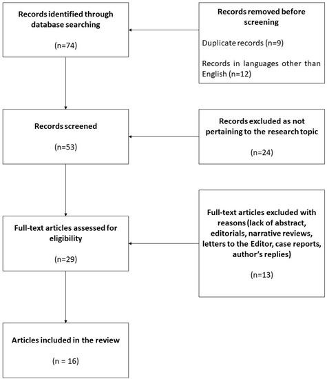 The systematic literature search retrieved 74 potential records for inclusion. Figure 1 shows a flow chart depicting the study selection process. Out of the 74 papers initially retrieved, 9 duplicates and 12 records in languages other than English were removed. Following a thorough screening of the literature search, among the 53 remaining records, 24 of them were ruled out as they did not pertain to the research topic. Additionally, 13 records were further excluded because they were one or more of the following: literature lacking abstracts, narrative reviews, editorials, letters to the Editor, case reports, and author’s replies. The remaining 16 full-text articles were selected for the present systematic review (Table 1).