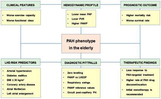 Demographic changes over the last decades have progressively influenced the phenotype of patients with PAH, with increasing mean age at the incident diagnosis of disease. Compared to their younger counterparts, elderly individuals with PAH have been shown to present a distinct profile, characterized by an increased burden of cardiovascular comorbidities, greater clinical deterioration, and reduced exercise capacity, despite a less severe hemodynamic impairment. They also showed a worse prognostic outcome, a lower response to PAH-targeted therapy, and a higher rate of PAH drug discontinuation, compared to young patients. The increasing incidence of isolated or combined post-capillary PH phenotypes with advanced age highlights the need for a careful phenotyping of PH in elderly individuals, in order to avoid misclassifications and improper treatments. Further investigations are needed in order to better clarify the nosologic criteria, diagnostic work-up, and therapeutic approach in this patient population.