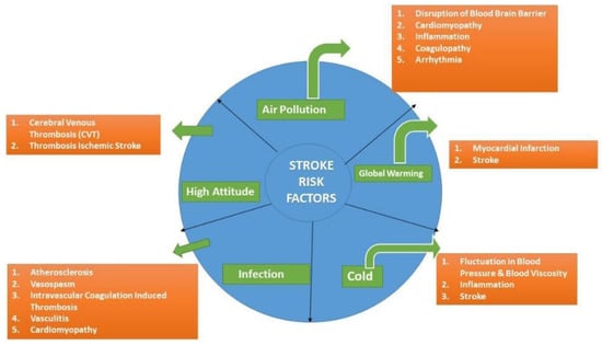 Climate change is defined as changes in weather patterns and is associated with significant adverse health outcomes. The Lancet Countdown on Health and Climate Change describes “climate change as the greatest global health threat facing the world in the 21st century” []. Global warming is a direct consequence of elevated greenhouse gas levels. This results in the retention of infrared radiation, thereby warming the atmosphere and the Earth’s surface. An increase in temperature due to global warming has been linked to a 50% rise in heat-related deaths among individuals aged over 65 years []. These deaths are linked to myocardial infarctions, strokes, and other mental health and neurological events []. On the other hand, cold-related morbidity has been attributed to cardiovascular stress, which is related to changes in blood pressure, blood viscosity, plasma fibrinogen levels, vasoconstriction, and associated inflammatory responses. The 2021 Global Burden of Disease study validated the risks of stroke associated with extreme temperatures []. Both extremely high and low temperatures have been linked to an increase in stroke incidence and mortality []. Global warming-induced temperature extremes can trigger geomagnetic storms, which have been associated with elevated stroke risk []. Furthermore, wildfires have also been linked to cardiovascular mortality and stroke [,,,].