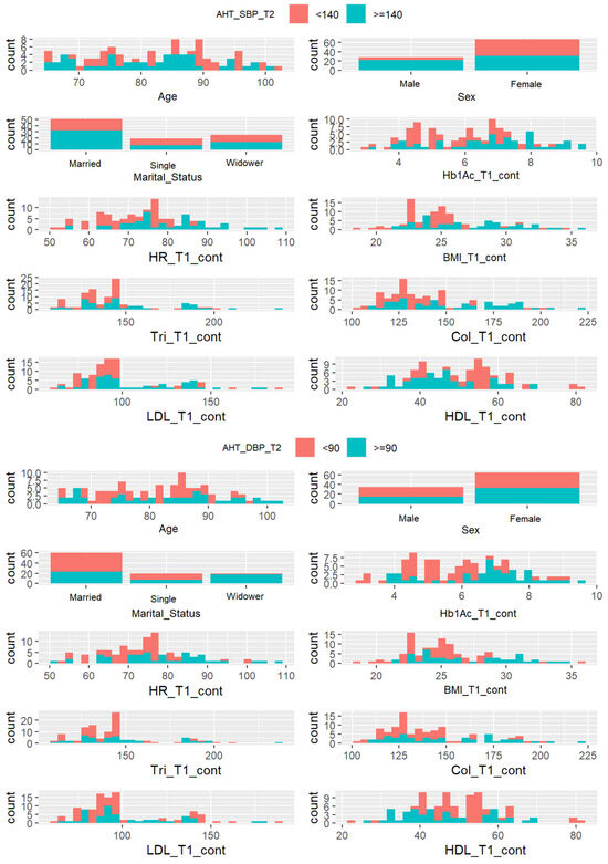 Figure 1 shows the overlapping histograms used for the classification of the risk of presenting high levels of systolic and diastolic AHT based on age, sex, and each clinical variable considered independently. Sex (male) and high values of HR, BMI, Tri, Chol, and LDL variables seem to be adequate as independent classifiers for systolic AHT. This is reflected in their histograms in Figure 1 (top) because the blue color that corresponds to a high level of systolic AHT is well separated for high values of these variables. On the other hand, high values of HR and BMI seem to be adequate for diastolic AHT, as shown in Figure 1 (bottom).