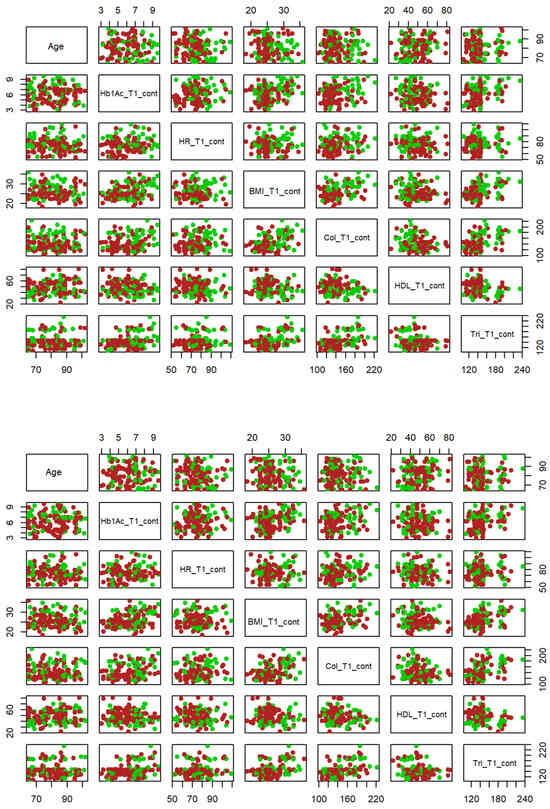 Figure 2 shows the potential applicability of classifiers of each pair of variables. The BMI and cholesterol (Chol) variables are jointly adequate classifiers for systolic AHT because the green and red dots are well separated in the corresponding bi-plot located (according to a matrix notation) in the fourth row with the fifth column. However, this pair of variables does not seem to be adequate for classifying diastolic HTA.