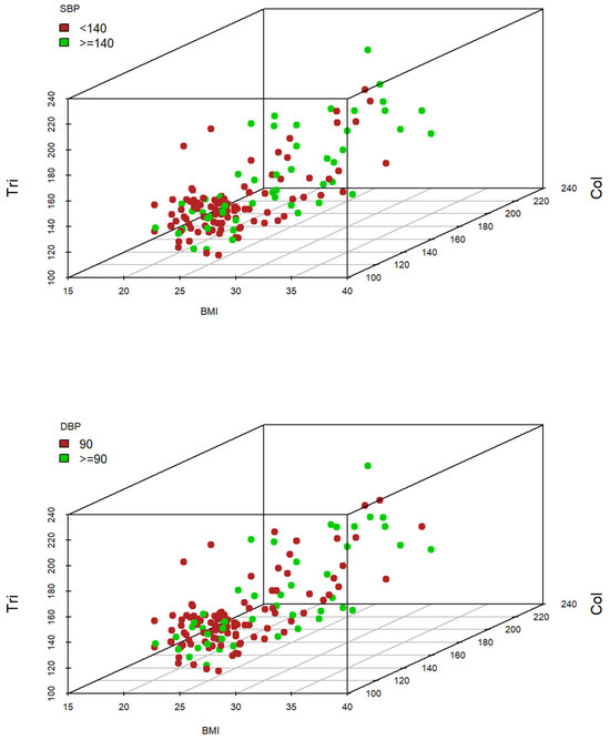 The cholesterol (Chol) variable, jointly with triglycerides (Tri) and BMI, provides adequate classifiers both for systolic and diastolic ATH, as shown by 3D scatterplots in Figure 3 since high values of these variables are identified simultaneously with high values of ATH (green dots).