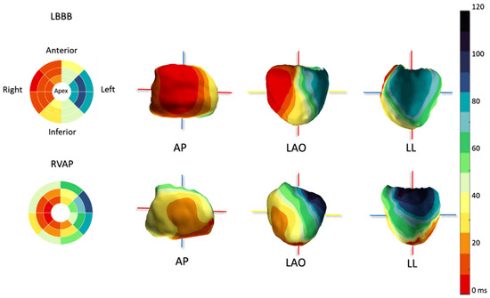 Typical 3D activation map of LBBB and RVAP. Averaged activation map per segment of 16 patients with normal axis LBBB (left top panel) and of 13 RVAP patients (left bottom panel). Three-dimensional activation maps of a typical LBBB (right top panel) and RVAP (right bottom panel). LBBB: left bundle branch block; RVAP: right ventricular apical pacing.
