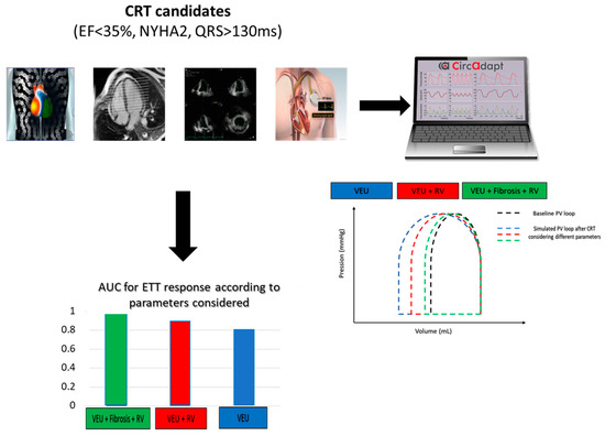 With the advent of artificial intelligence and increasingly powerful computer models, the future of cardiac resynchronization may lie in model-based patient selection. For example, the CircAdapt model allows the right and left ventricles to be subdivided into several segments, so that local electromechanical and interventricular inhomogeneity can be simulated [41]. Thus, segment activation times, as well as the electrical activation delay between the RV and LV (and therefore the VEU), are adjustable variables in CircAdapt, as are local or regional myocardial viability/rigidity and RV function. Variables such as VEU, SSI, fibrosis and RV function will be entered individually and jointly to explore the impact of each parameter on the variation in myocardial output in response to CRT. Thus, for each variable entered into the model, CircAdapt results in an individualized flow variation. These flow variations could be used to construct ROC curves (response prediction), enabling models to be compared with each other. This strategy is based on the assumption that acute variations in cardiac output are correlated with ventricular remodeling after CRT (Figure 5) [42].
