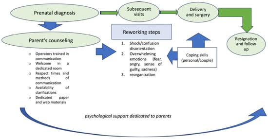 Although much of the research conducted has focused on the role of stress and the emotional component experienced by parents following fetal malformation diagnosis, little attention has been paid to management actions implemented by parents through the utilization of coping strategies, usually based on their personal resources (emotional, cognitive, economic). For example, higher levels of acceptance and management were associated with low levels of anxiety, depression, and traumatic stress [5]. Additionally, fewer studies have focused on parental coping following postnatal diagnosis compared to prenatal CHD diagnosis, thus not considering the temporal aspect that is linked to the prenatal stress suffered by the mother and transmitted to the fetus via the placenta [24]. Starting from the moment of the inauspicious diagnosis, a completely different chapter in the lives of the parents is opened by inevitably focusing attention on aspects that, until recently, were totally unknown and unexplored.