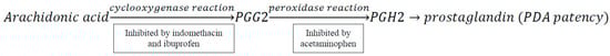 The pharmacological treatment options for PDA closure involve the use of indomethacin, ibuprofen, and acetaminophen (also known as paracetamol). Non-steroid anti-inflammatory drugs (indomethacin and ibuprofen) inhibit prostaglandin synthesis via inhibiting cyclooxygenase (COX) reaction, while acetaminophen inhibits peroxidase action (Figure 1).