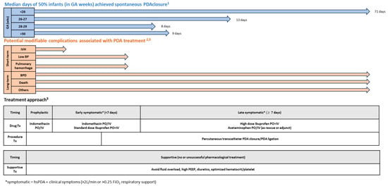 Many PDA management clinical guidelines have been published [,,]. Besides GA, chronological age, timing to initial treatment, and desired outcomes are crucial considerations in choosing the optimal treatment approach. The Canadian Pediatric Society [] and American Academy of Pediatrics [] offer similar approaches under the general principles of targeted treatment: