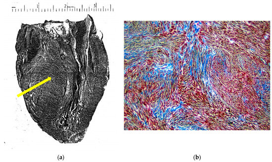 Figure 1. (a) The original picture of a cardiac specimen from the Donald Teare paper [1]. Coincidentally, the cut was performed along the long axis of the left ventricle, similar to the current 2D echo tomographic section, depicting the septal asymmetric hypertrophy (arrow). (b) Myocardial disarray under a light microscope, mimicking a hamartoma. Azan-Mallory stain, low magnification.