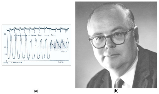 Figure 3. (a) Mr. Brady’s continuous pullback pressure tracing, recorded as the catheter was withdrawn from the LV cavity through the outflow tract across the aortic valve and into the aorta. Reproduced with permission from [2]. (b) Andrew Glenn Morrow’s picture, chief of Cardiac Surgery at the NIH in the 1960s. He wrote the paper reporting the first patient with HCM and subaortic gradient [3].