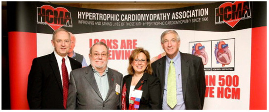 Figure 5. A recent picture of Mr. Brady, the first patient in the USA diagnosed as affected by idiopathic hypertrophic subaortic stenosis (with Dr. Bonow (left), Mrs. Salberg (middle), and Dr. Maron (right)) [6].