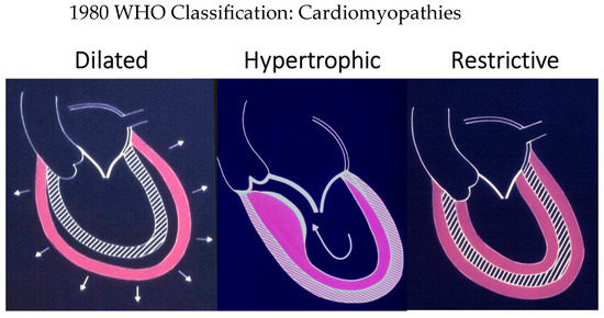 8. Richardson, P.; McKenna, W.; Bristow, M.; Maisch, B.; Mautner, B.; O’Connell, J.; Olsen, E.; Thiene, G.; Goodwin, J.; Gyarfas, I.; et al. Report of the 1995 World Health Organization/International Society and Federation of Cardiology Task Force on the Definition and Classification of cardiomyopathies. Circulation 1996, 93, 841–842. [Google Scholar]