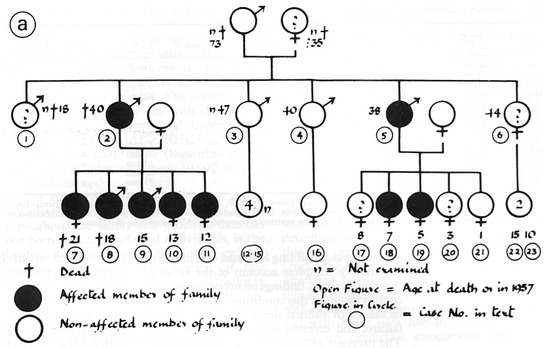 Although a familial occurrence was noticed early in Teare’s report as suspected genetically determined cardiomyopathy, the first disease-related gene was discovered in 1989–1990 by the Seidman group in Boston, consisting of the missense mutation of the β-cardiac myosin heavy chain in chromosome 14 [9,10]. The molecular investigation was made in the same original Teare family (Figure 9) [11,12].