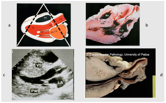 Figure 11. Image of 2D echocardiography, the revolutionary non-invasive diagnostic technique for an easy visualization of asymmetric hypertrophy. (a) Schematic long-axis tomographic view at 2D cardiac echo. (b) The equivalent in a normal heart. (c) The 2D echo in hypertrophic cardiomyopathy. (d) Cardiac specimen of (c), with septal asymmetric hypertrophy. A = aorta; AA = ascending aorta; AV = aortic valve; LA = left atrium; LV = left ventricle; PW = posterior wall; RV = right ventricle; and VS = ventricular septum.