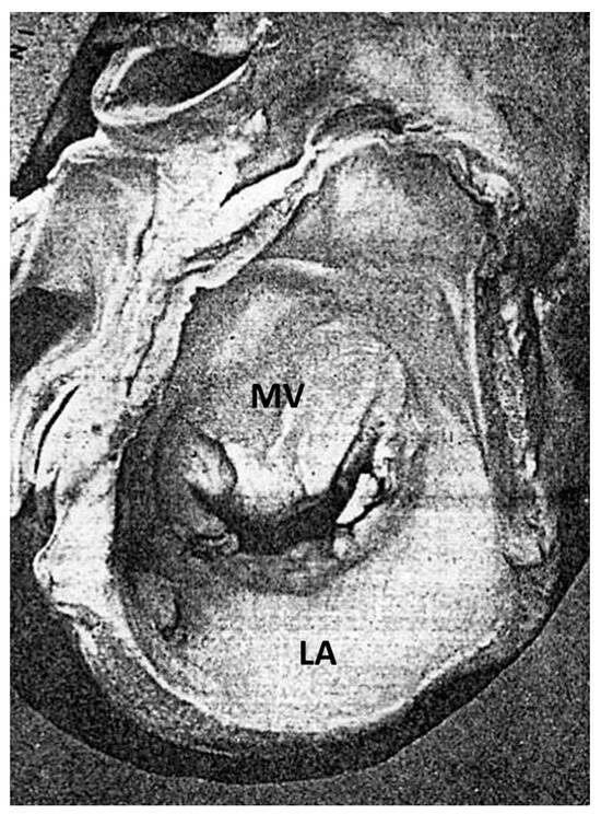 Figure 15. A figure from Teare’s original paper [1] representing a cardiac specimen with a dilated left atrium. LA = left atrium; MV = mitral valve.